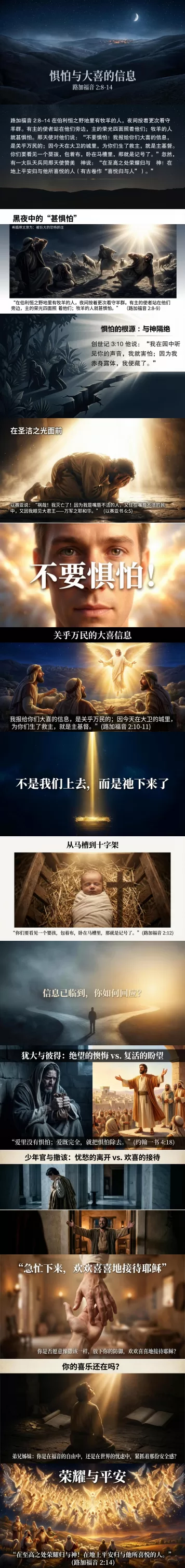 路加福音 2:8-14 在伯利恒之野地里有牧羊的人,夜间按着更次看守羊群。有主的使者站在他们旁边,主的荣光四面照着他们;牧羊的人就甚惧怕。那天使对他们说:“不要惧怕!我报给你们大喜的信息,是关乎万民的;因今天在大卫的城里,为你们生了救主,就是主基督。你们要看见一个婴孩,包着布,卧在马槽里,那就是记号了。”忽然,有一大队天兵同那天使赞美 神说:“在至高之处荣耀归与 神!在地上平安归与他所喜悦的人(有古卷作“喜悦归与人”)。”